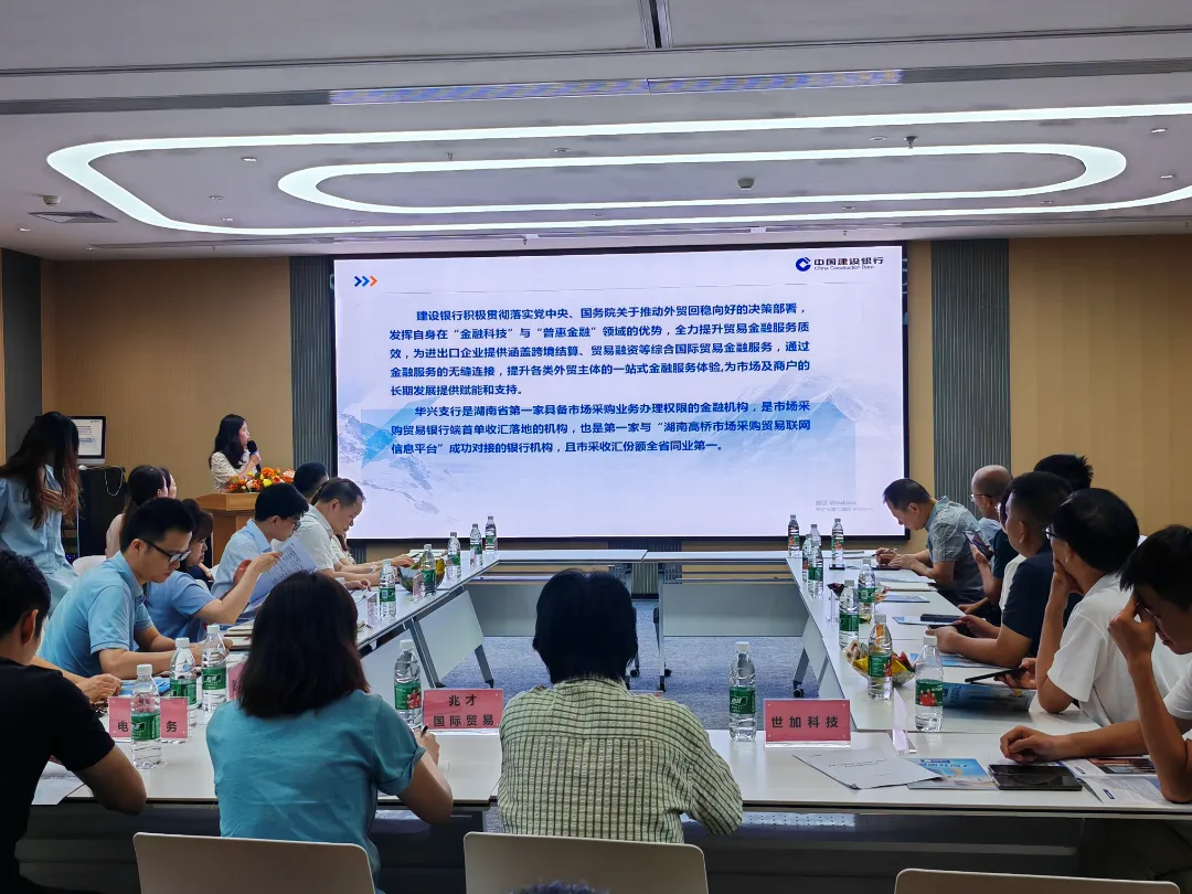 在会上,银行界代表们相继发言,带来了深入浅出的分享。湖南银行总行交易银行部的张峻华、建设银行长沙明昇壹城支行副行长唐纯、长沙银行高桥支行对公客户经理杨云皓经理等,细致讲述了各自银行的服务与产品。他们不仅展示了广泛的金融服务范围,还结合跨境电商企业具体需求提出了切实的合作方案,赢得了与会企业代表的阵阵掌声。